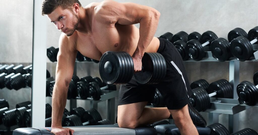 Outro exercício que pode ser realizado somente com halteres é o tríceps coice, que tem a vantagem de trabalhar o músculo de forma mais isolada.