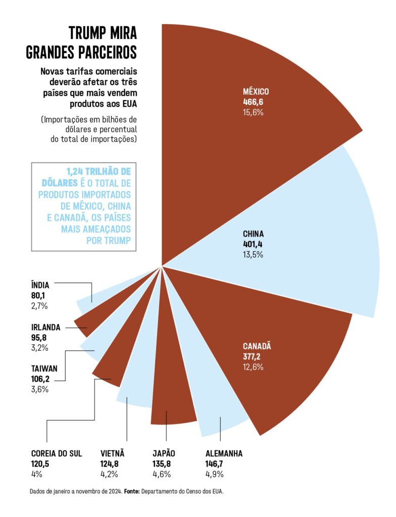 Os três países afetados pelas tarifas de Trump representam mais de um terço do total das importações americanas. Os governos dos três prometeram retaliações, o que poderá dar início a uma guerra comercial de grandes proporções.