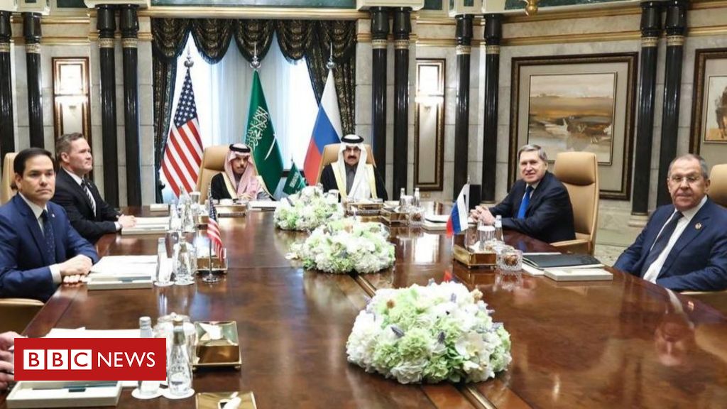 Legenda da foto, Funcionários de alto escalão dos EUA e da Rússia se encontraram em Riad na primeira cúpula desse tipo em anos