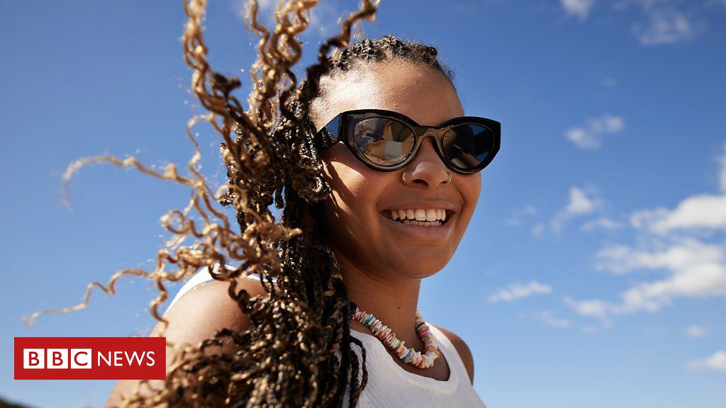 Jovem negra de tranças compridas usando um óculos de sol e sorrindo contra um céu azul