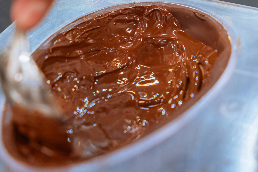 Por último, é preciso fechar a casca, com uma nova camada de chocolate temperado. “Você vai espalhar esse chocolate por cima do recheio com uma colher. Tem que tomar cuidado com os cantinhos, para selar toda a lateral. Normalmente esses recheios são perecíveis e se ficar um buraquinho tem risco de estragar”, diz Biselli.