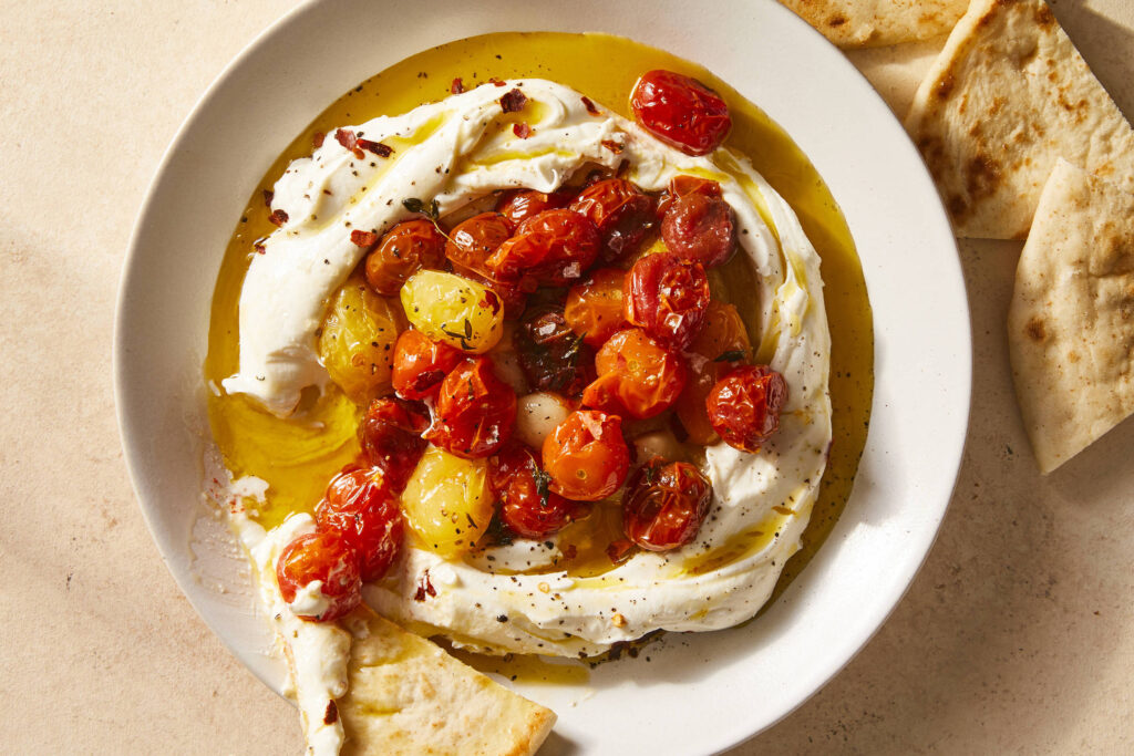 Coalhada seca é a pasta perfeita para qualquer estação ou ocasião. Muitas coberturas funcionam com o creme, mas uma que merece o trono durante todo o verão é a de tomates-cereja, quando estão brilhantes e assados em azeite de oliva —com dentes de alho inteiros— até ficarem inchados, murchos e macios o suficiente para estourar.