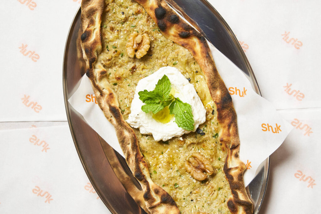 Inaugurado em 2022, em Pinheiros, o Shuk serve três preparos que se enquadram no que o paulistano entende por esfiha: a lahmajun, aberta e bem fininha, com bastante recheio, para enrolar na hora de comer; a pidé, em formato de barca; e a manoush, versão aberta sem tanto recheio. “Todos partem da mesma massa, que leva pouco fermento”, conta o sócio Mauro Brosso.