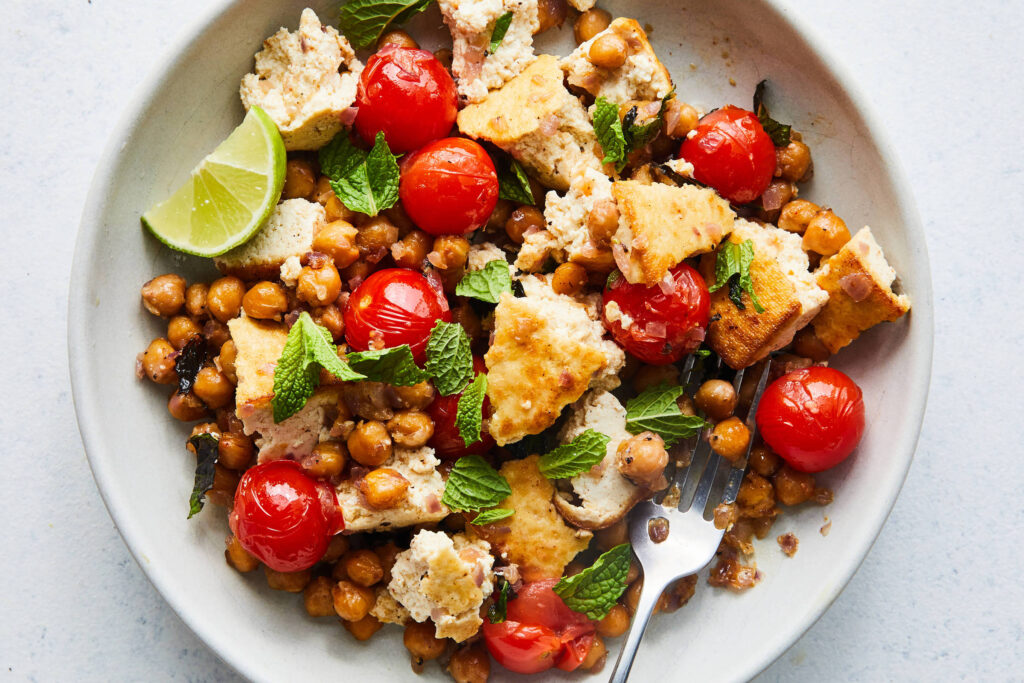 6. Aumente o fogo para médio-alto, adicione a 1/2 colher de sopa restante de manteiga, depois os tomates e 1 colher (chá) de sal. Cozinhe sem mexer até que os tomates comecem a estourar e o grão-de-bico esteja bem aquecido, cerca de 4 a 5 minutos. Misture a hortelã