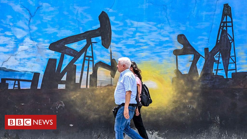 Pessoas caminham em frente a um mural que representa bombas de petróleo em Caracas