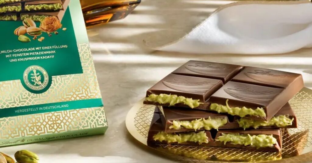 A novidade se inspira nas criações da Fix Dessert Chocolatier, confeitaria de Dubai que viralizou nas redes sociais com recheios que misturam cremosidade e crocância – e nomes divertidos como Can’t Get Knafeh Of It, em referência ao knafeh, doce típico da região. A versão da Lindt é uma adaptação com assinatura própria: a barra de 145g combina o clássico chocolate ao leite da marca com recheio cremoso de pistache (que representa 45% da composição), crocante de kadaif – uma massa típica em fios finíssimos – e um toque aveludado de tahine.