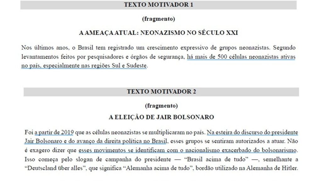 Na prova, os candidatos foram provocados a escrever sobre o “avanço do neonazismo no Brasil” e os “desafios para a democracia no século XXI”. Para isso, o vestibular apoiou o tema em dois textos: o primeiro, com o título “A ameaça atual: neonazismo no século XXI” e o segundo, intitulado “A eleição de Jair Bolsonaro”.