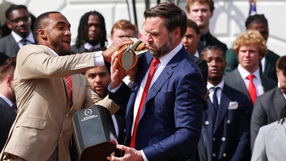 O evento celebrou a conquista da equipe da Universidade Estadual de Ohio, vencedora do Campeonato Nacional de Futebol Americano Universitário. Os atletas foram recebidos por Vance e pelo presidente Donald Trump, que posou para fotos com uma camisa personalizada com o número 47, em alusão à possibilidade de se tornar o 47º presidente dos Estados Unidos em um eventual novo mandato.