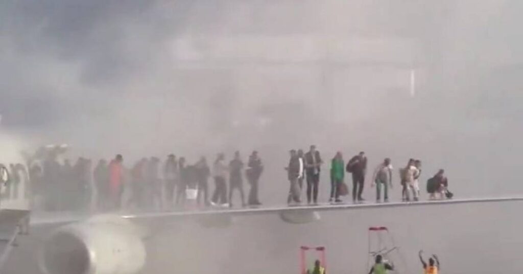 Passageiros se aglomeram sobre a asa do avião após usarem saída de emergência (//Reprodução)
